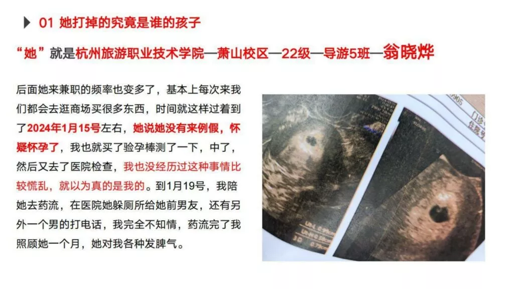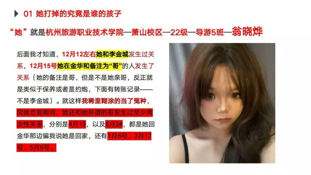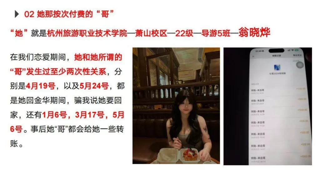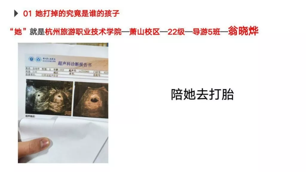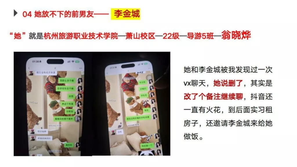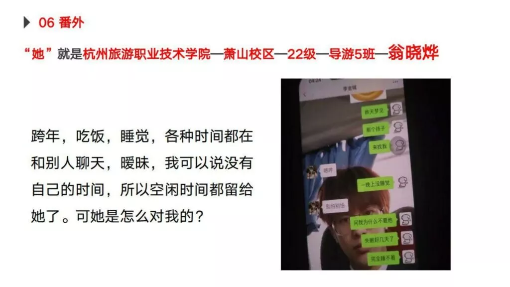 30页PPT揭露了杭州旅游职业技术学院的女学生翁晓烨的感情经历。在与前男友分手后,她迅速开始了新恋情,表面上看似寻求爱情,实际上却是为了寻找接盘侠。在玩弄男生感情的同时,她还与前男友保持暧昧关系。更令人震惊的是,她谎称自己怀孕,但实际上是因为前男友的怀孕而寻求接盘侠承担堕胎费用。