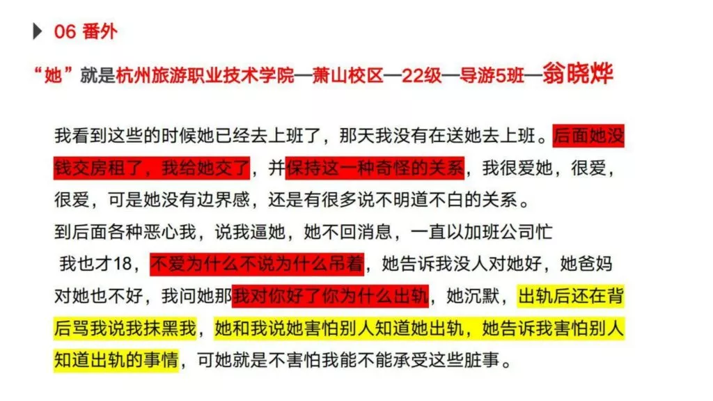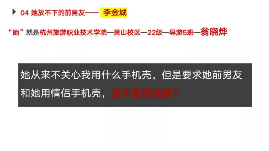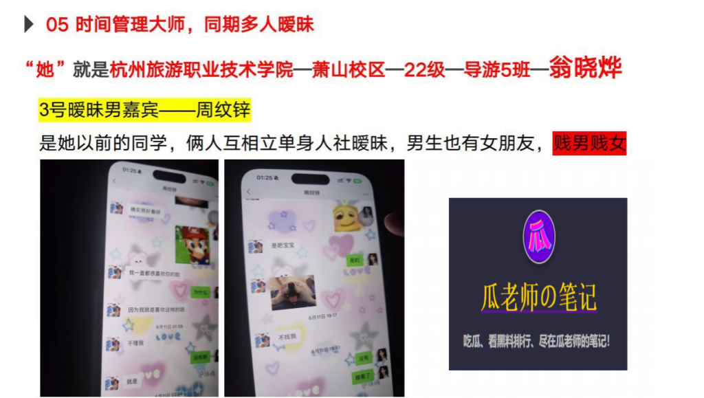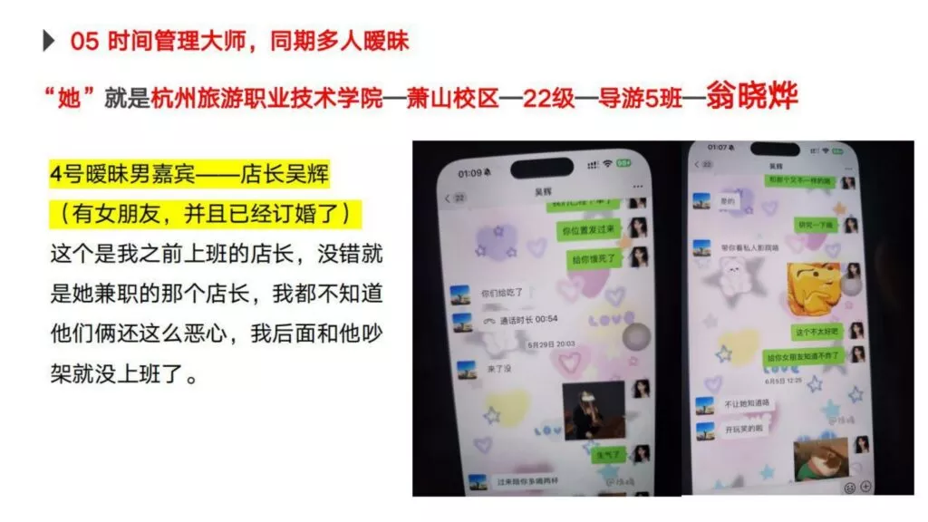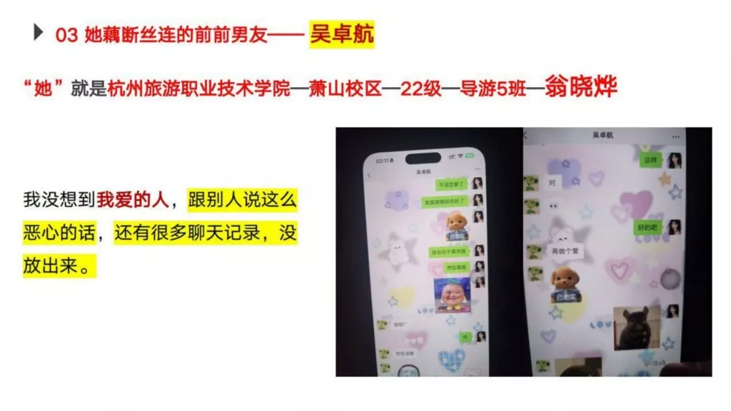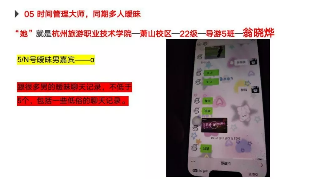 30页PPT揭露了杭州旅游职业技术学院的女学生翁晓烨的感情经历。在与前男友分手后,她迅速开始了新恋情,表面上看似寻求爱情,实际上却是为了寻找接盘侠。在玩弄男生感情的同时,她还与前男友保持暧昧关系。更令人震惊的是,她谎称自己怀孕,但实际上是因为前男友的怀孕而寻求接盘侠承担堕胎费用。